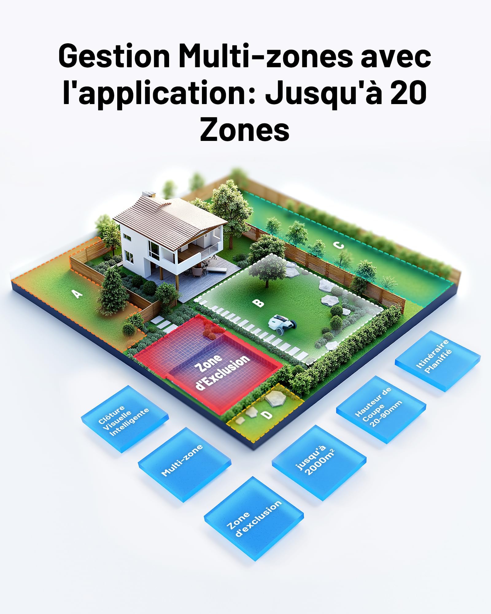 • Contrôlefacile avec l'applicaion et motifs Créative sur Pelouse: Il est facile de configurer jusqu'à 10 zones de travail, chaque zone de tonte pouvant avoir son propre planning, son propre schéma de tonte et sa propre hauteur de coupe. l'algorithme d'impression sur pelouse permet de créer de manière simple des designs uniques. Avec l'application Mammotion , vous pouvez non seulement créer des zones d'exclusion, mais aussi contrôler votre robot n'importe où et à n'importe quel moment