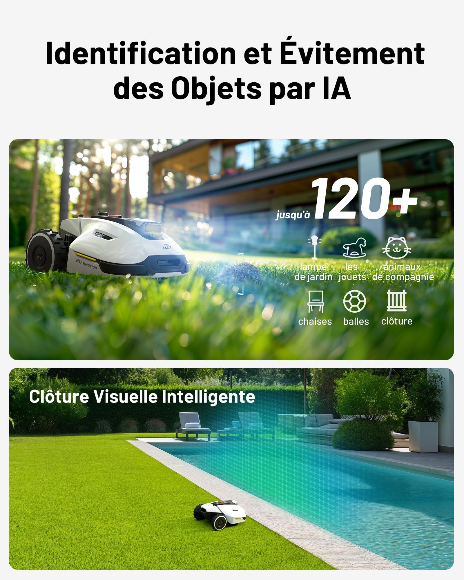 • Détection d'objets plus Intelligente et plus sûre Grâce à Vision Binoculaire 3D: Grâce à l'identification et à l'évitement des objets par l'IA, YUKA détecte et évite les obstacles jusqu'à 2,5cm, ajustant dynamiquement les trajectoires pour une tonte efficace, tout en garantissant la sécurité des enfants et des animaux domestiques. L'algorithme piloté par l'IA de YUKA assure une coupe précise au plus près des bordures et des murs avec pluisieurs modes de coupe