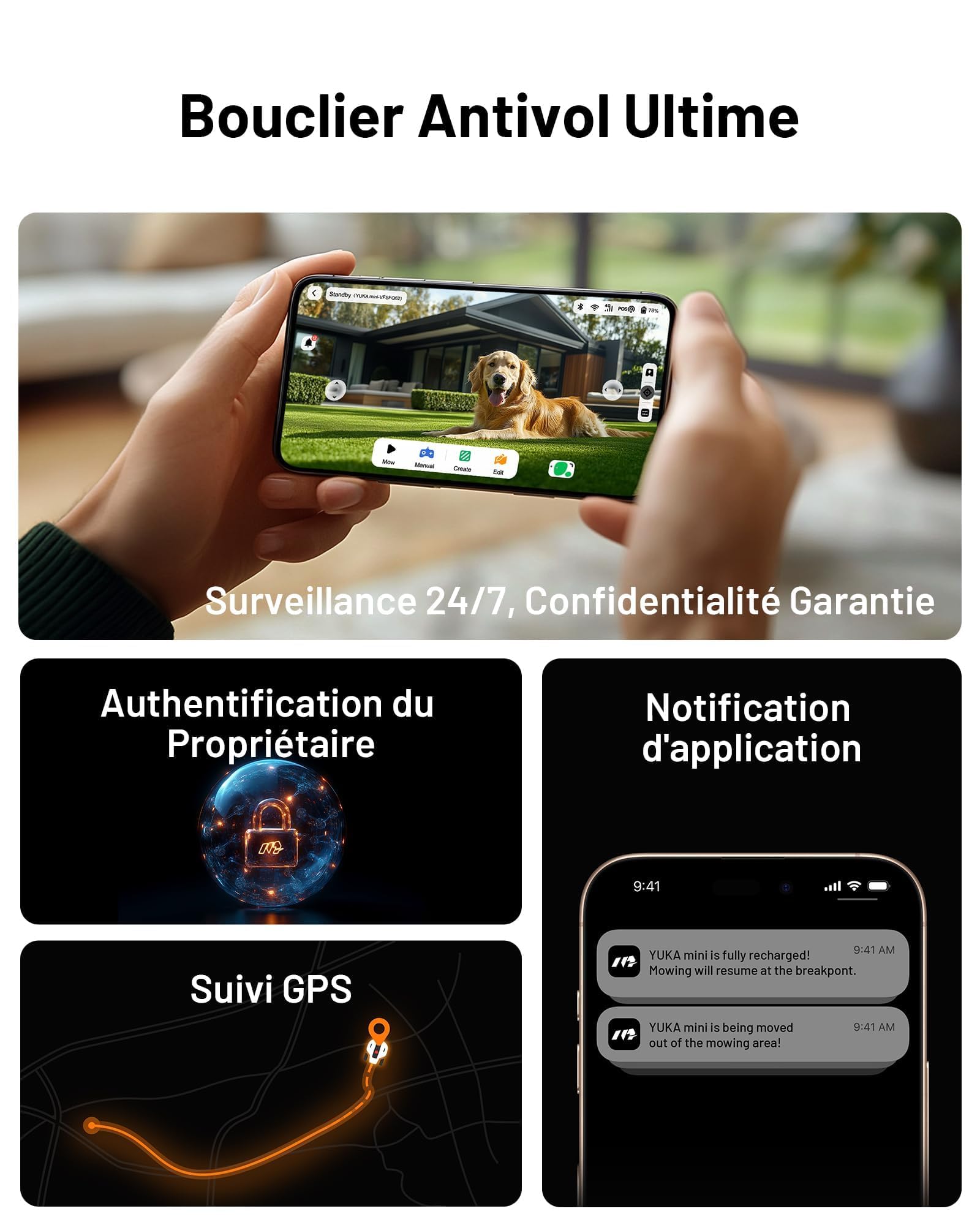 • Réglez une fois, gagnez le reste : Basé sur la technologie avancée de vision IA et RTK, YUKA mini peut créer des cartes virtuelles de manière autonome dans l'application Mammotion. Pour une pelouse de 800 mètres carrés, il peut générer une carte entière en seulement 10 minutes. Installation sans fil périphérique et plus besoin de le déplacer manuellement sur la pelouse ! L'algorithme piloté par IA de YUKA mini garantit une couverture précise des coins aux bords, avec une précision de coupe à moins de 5 cm* du mur, garantissant des bords nets.